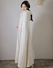 Warm hood to cover your ears, ribbon front ties, with white fur accents. A timeless piece worn throughout Chinese history, the Doupeng 斗篷 is a beloved garment and a must-have for any hanfu enthusiast.