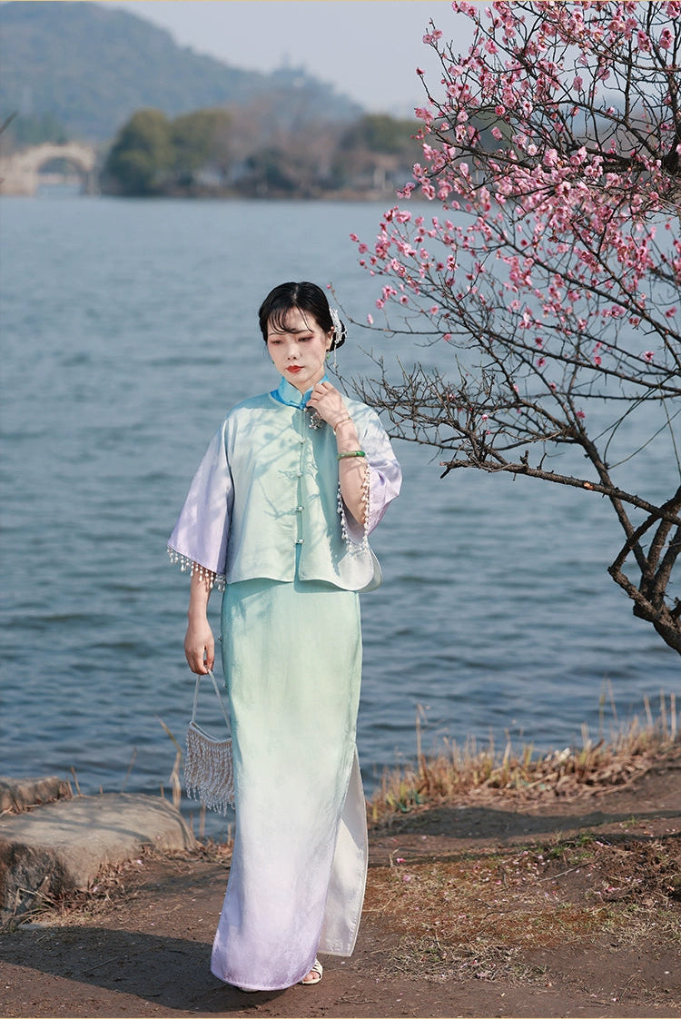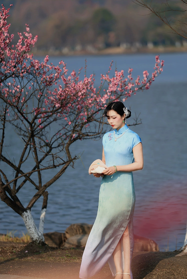 Made in the 1930s style with hand-dyed pastel gradient, this dress blends Shanghai style with French romance. Subtle maple leaf jacquard adds a traditional vibe to this otherwise contemporary color scheme.