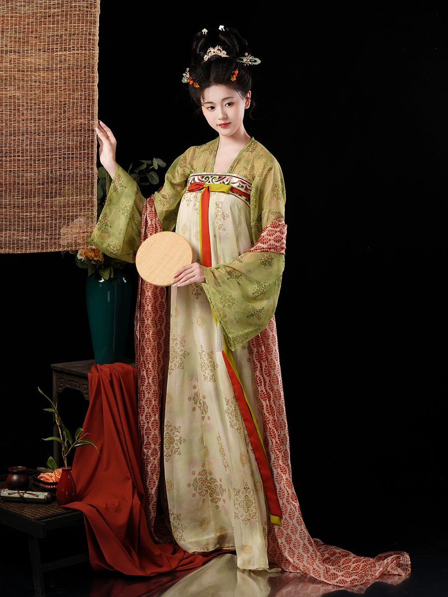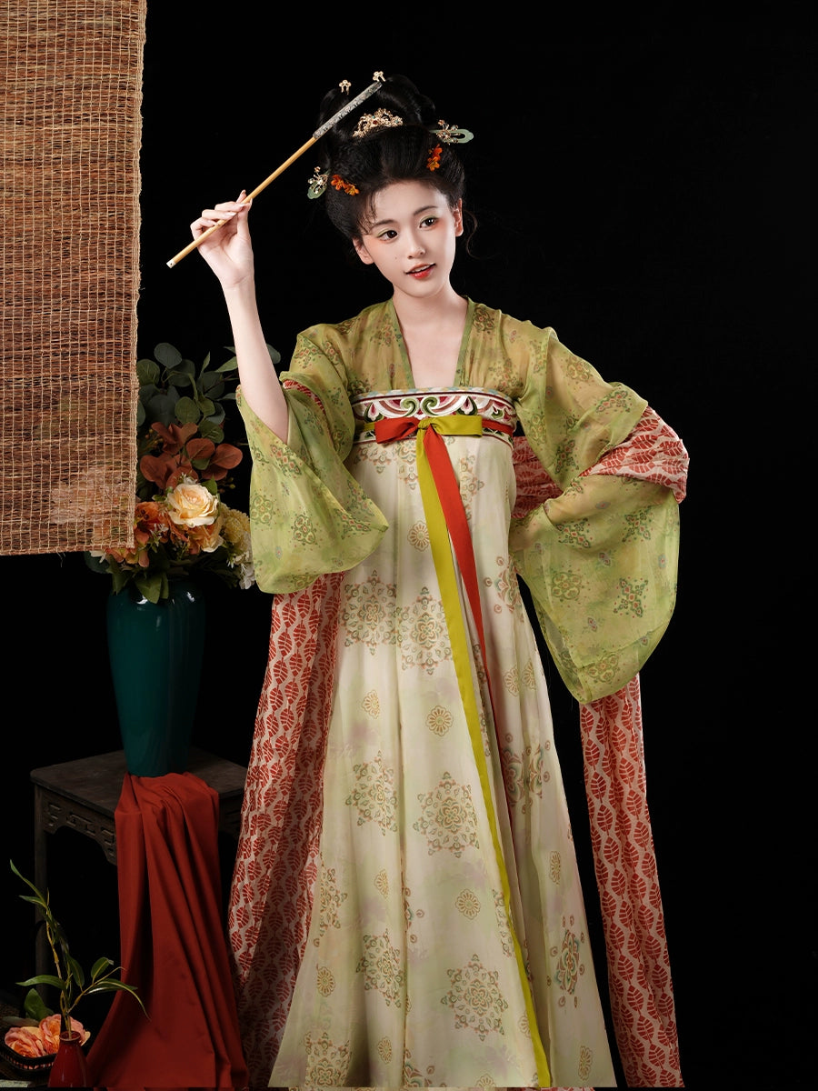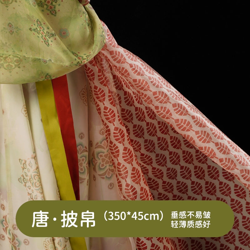 Delicate patterns of Tang Dynasty floral patterns, contrasting red patterned Pibo 披帛 shawl adds dimension to the set.