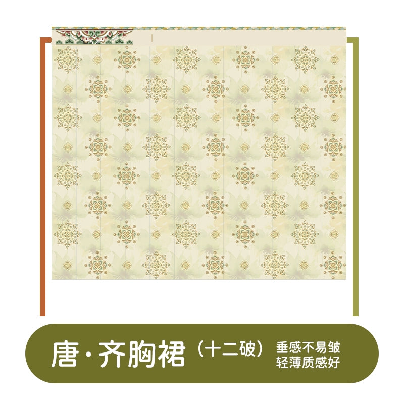 The chest-high skirt is a quintessential piece of 7th century fashions and is brought back to life in this 12 panel Po Qixiong Qun 破齐胸裙 ("broken" chest high skirt). Don't worry, it's not actually broken - it refers to the many strips of fabric sewn together to create a whole skirt.
