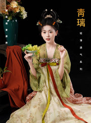 Steep in the serene colors of a bamboo grove with our Qing Li 青璃 Bamboo Glaze Qixiong Ruqun Set! Featuring an embroidered hezi 诃子 (upper skirt band) in rich Tang Dynasty colors and designs.