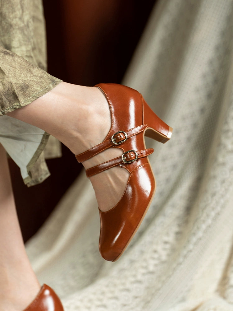 Aizhai 矮寨 Double Bridge 1930s Republic of China Style Wine-Glass Heel Genuine Leather Mary Janes