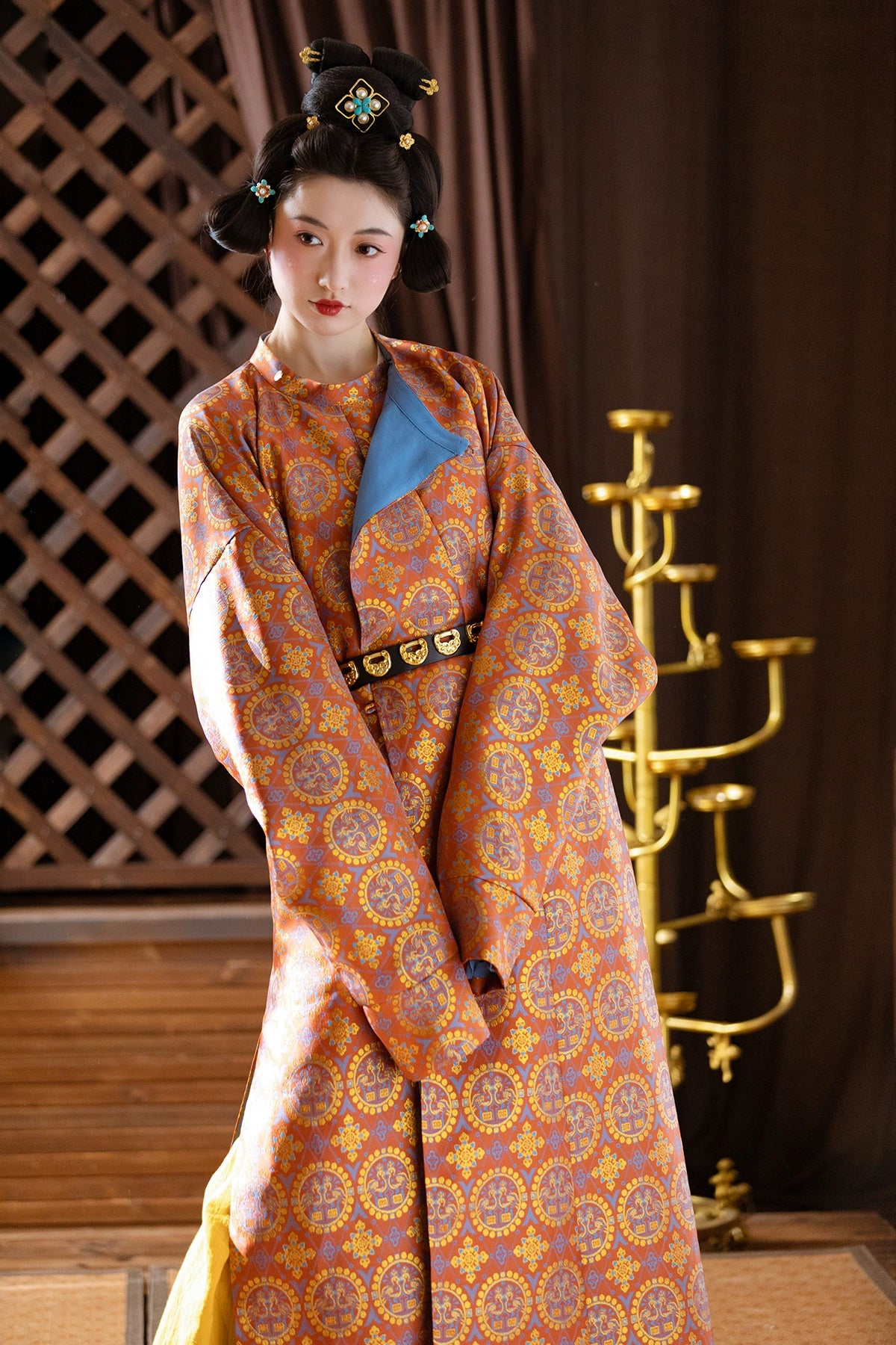 Pearl Birds 团窠联珠对鸟纹 Brocade Unisex Yuanlingpao Round Collar Robe