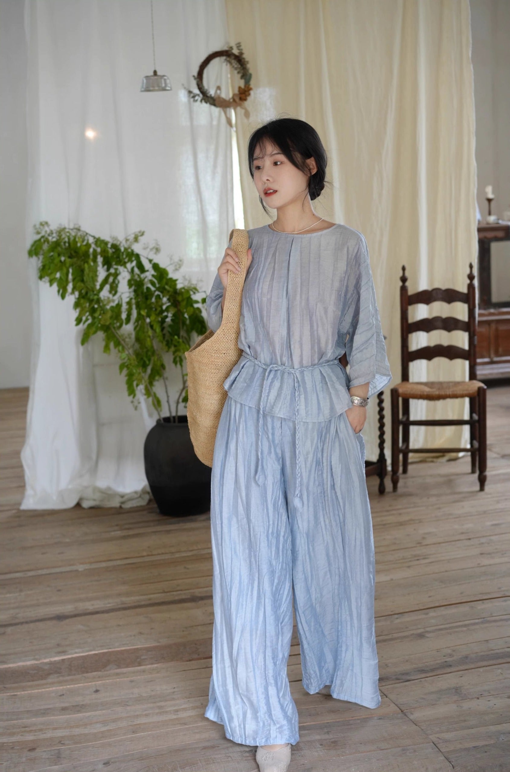 Ziruo 自若 Modernized Ming Dynasty Summer Tencel Shirt & Wide Leg Trousers Set