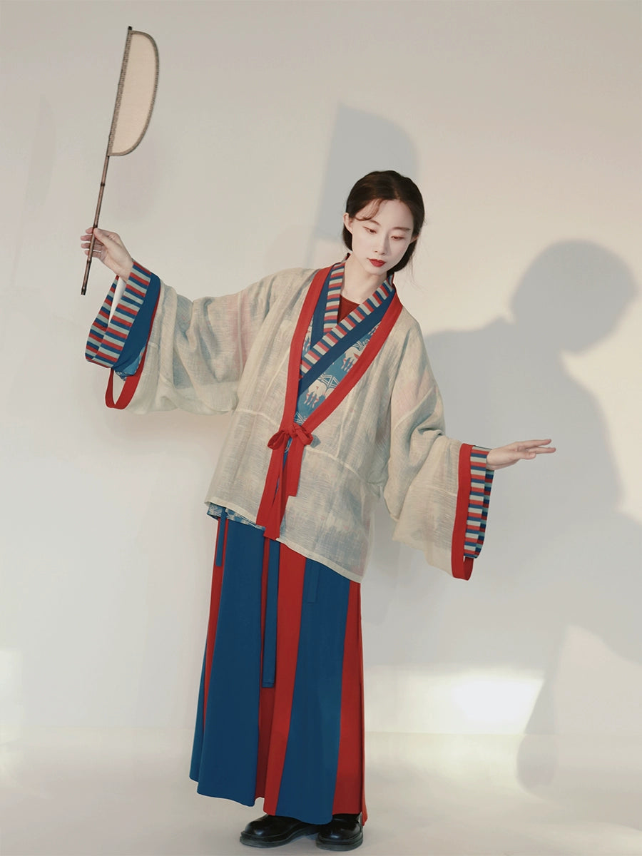 Set comes with layered Yaolan Ru 腰襕襦 "wide waist shirts" from the Jin Dynasty & Poqun 破裙 "broken skirt".