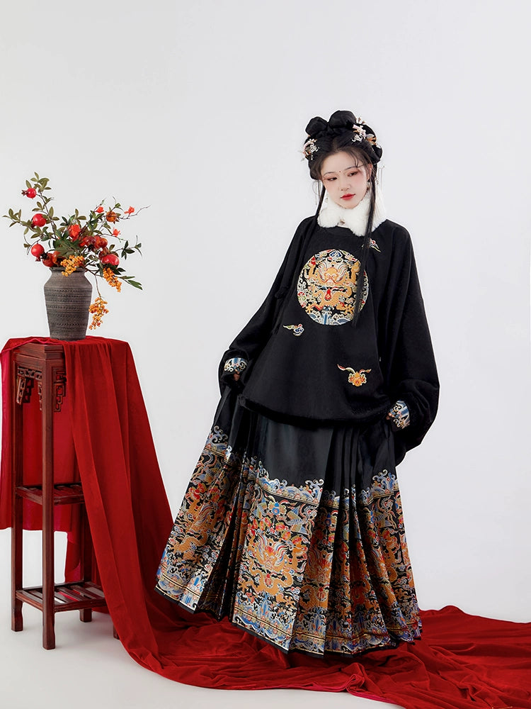 The Mamian Qun 马面裙, or horse faced skirt, features woven designs of Qing dynasty style dragons completing the Qing style embroidery of the bijia 比甲.