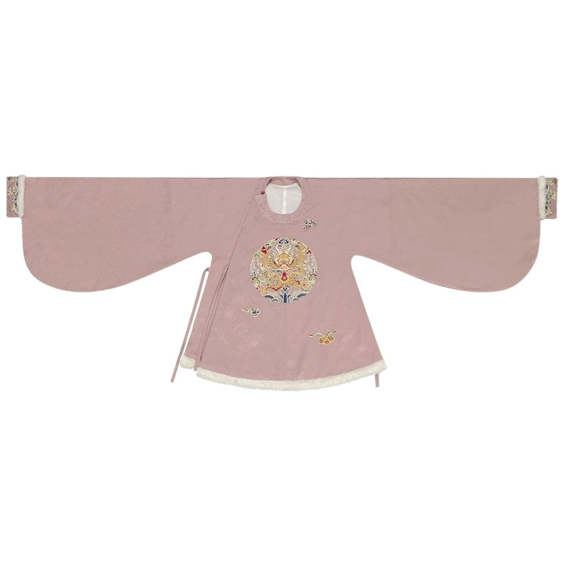 The round collared robe features an embroidered royal dragon emblem in the traditional style of Qing royalty. Add an optional vegan fur-lined short vest called Bijia 比甲 for an additional layer, an adorable addition to any Ming outfit.