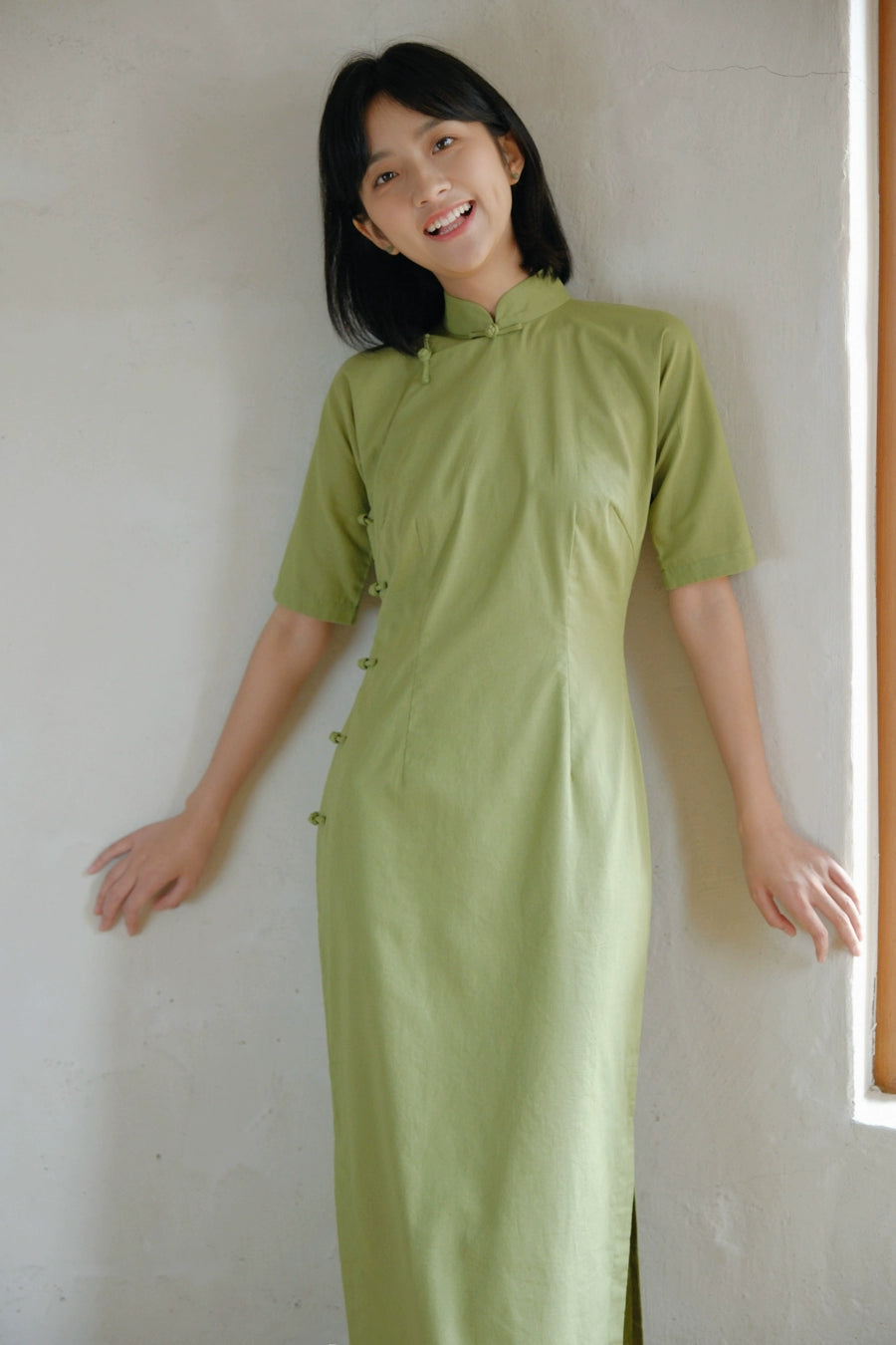 Lüsün 芦笋 Asparagus Republic of China Jacquard Cotton Short Sleeve Qipao