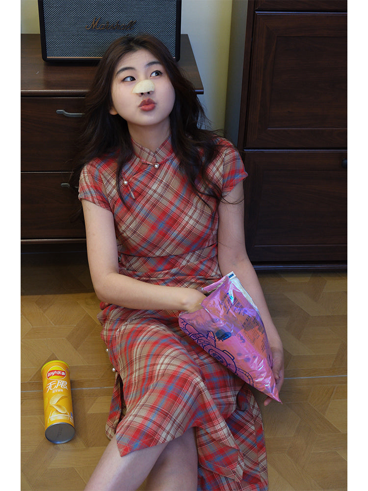 Yecan Tan 野餐毯 Picnic Blanket Republic of China Gingham Pure Cotton Short Sleeve Qipao