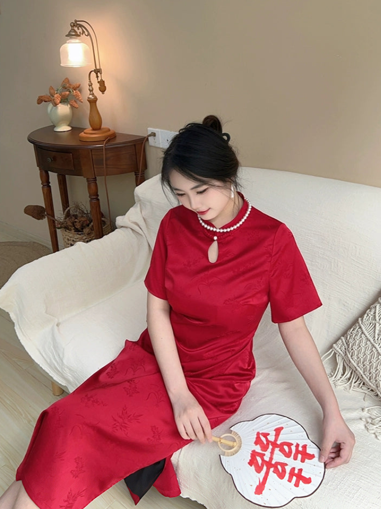 Hong Zhuang 红妆 Red Makeup Plus Size New Chinese Style Ruched Satin Qipao