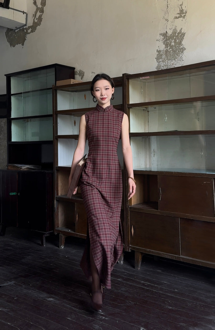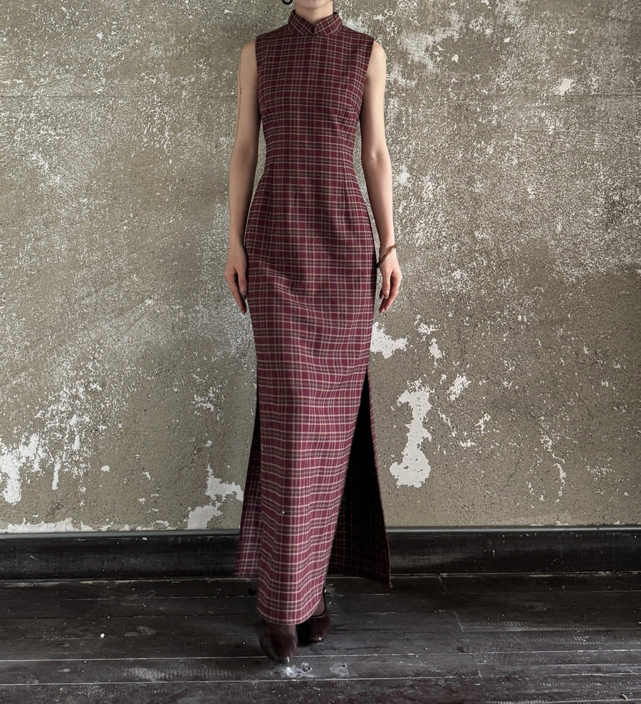 Yan Hong 砚红 Red Ink Modernized Plaid Flannel Sleeveless Qipao