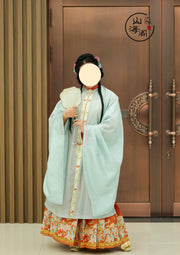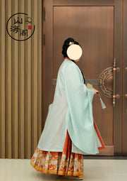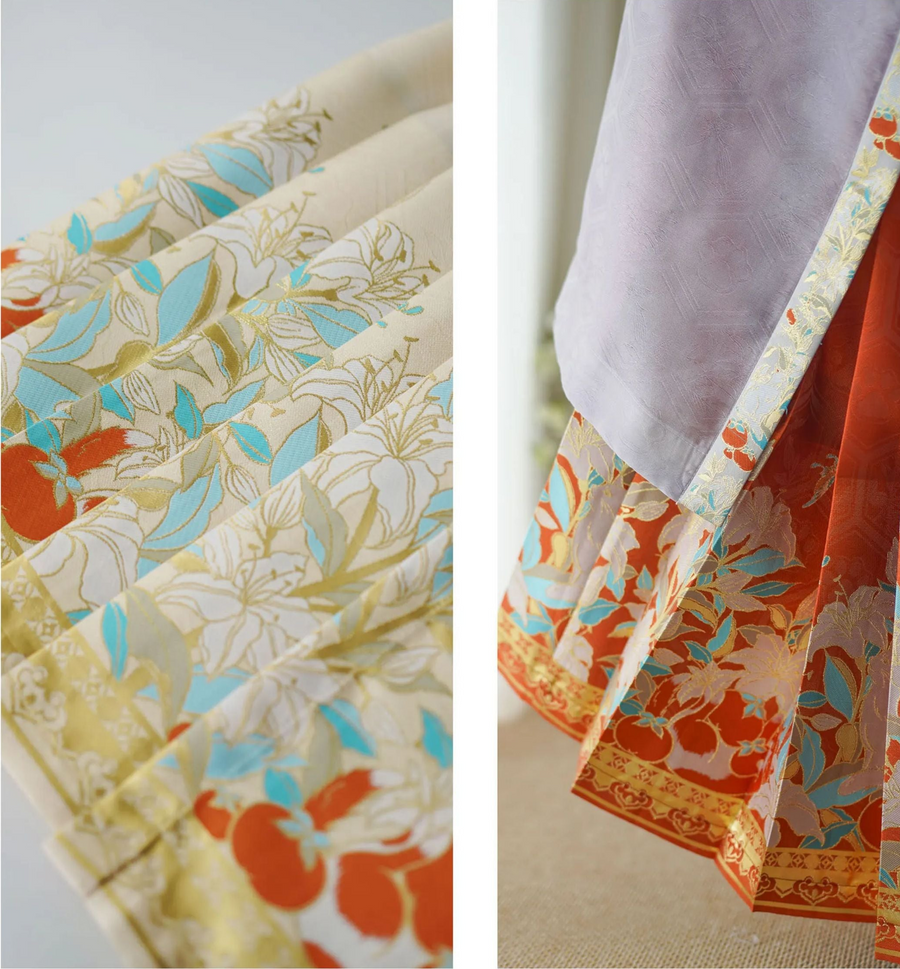 Get the matching Mamian Qun 马面裙 (horse face skirt), a quintessential garment of the era. Shining brocades of persimmons and kittens tie the entire outfit together.