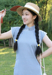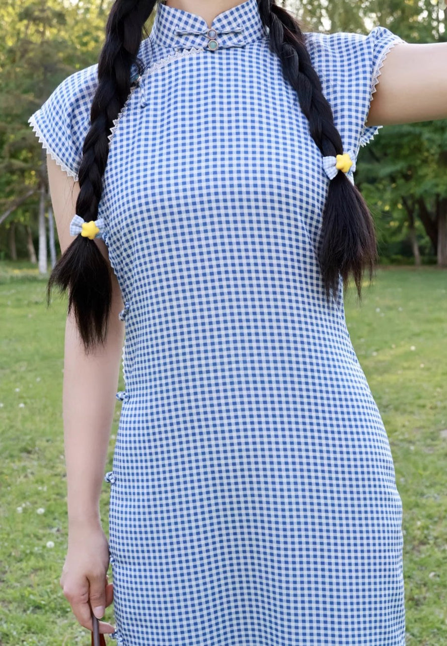 Bing Lan 冰蓝 Icy Blue 1930s Gingham & Lace Cap Sleeve Qipao