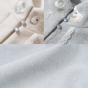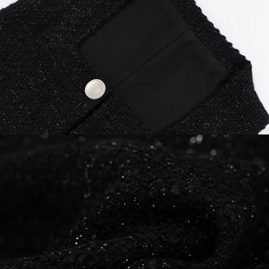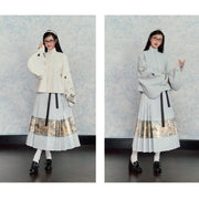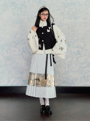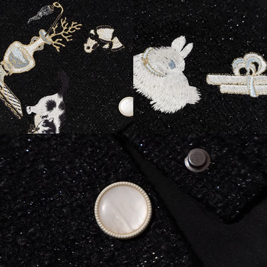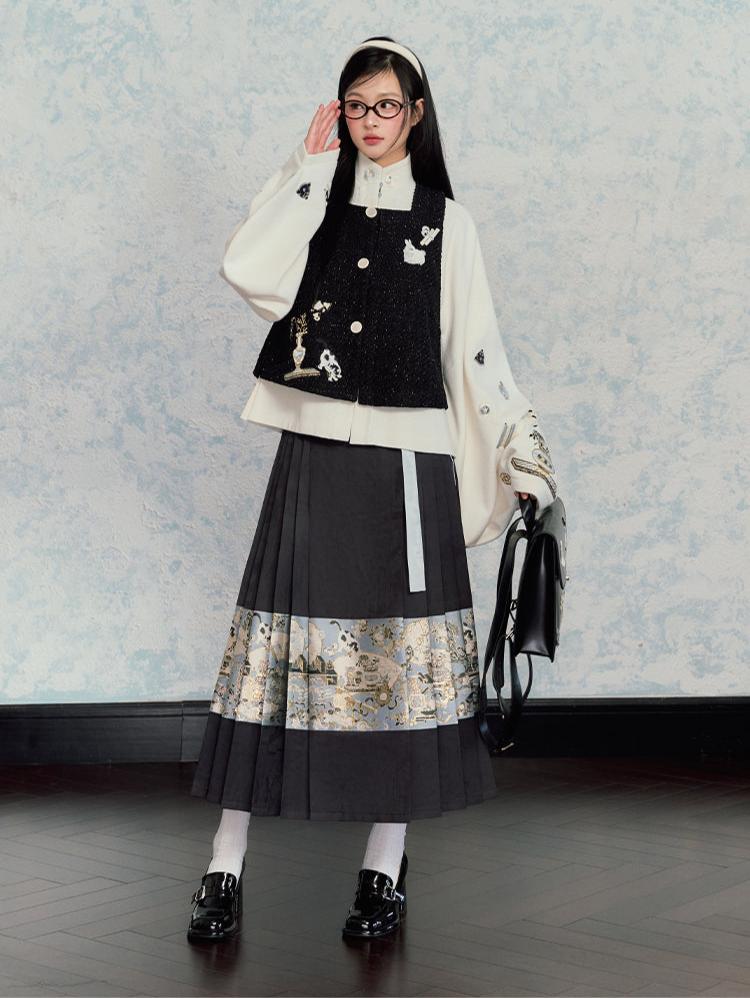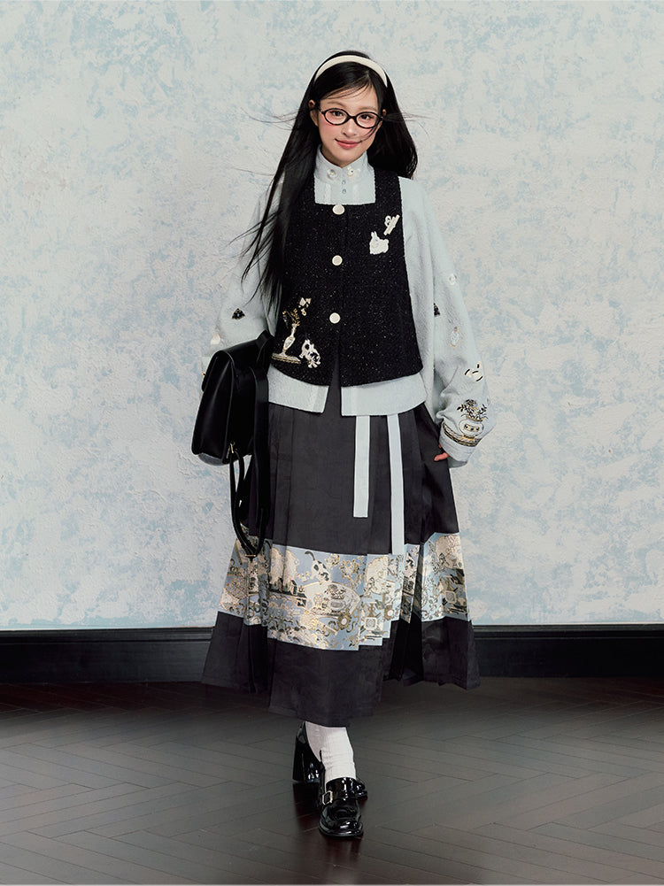 The matching Fangling Bijia 方领比甲 (square collar short vest) features a kitten playing with a flower in one corner, and a rabbit gazing at scrolls in the other. Sparkling tweed fabric, light weaving but thick for great layering effect. The square collar is perfect for the floral embroidery on the shirt to peek through ~