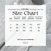 - Liling Duijin Shan 立领对襟衫 (standing collar parallel panel top) - 67.3% polyester, 23.4% viscose, 9.3% acrylic
