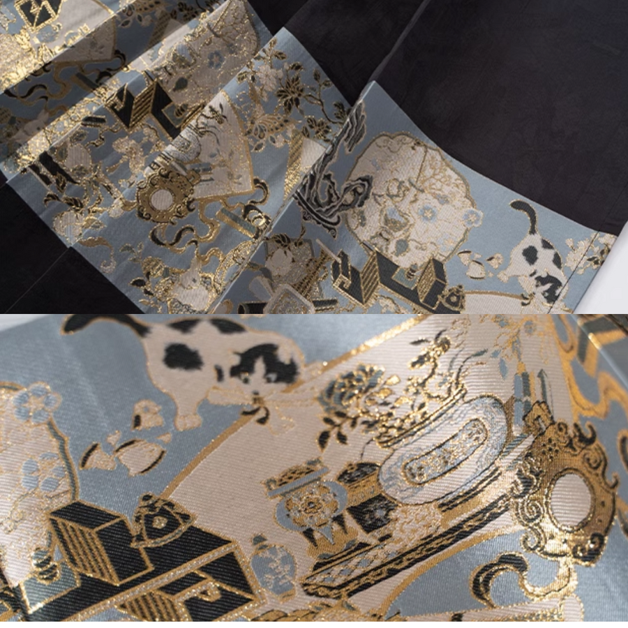 Finally, add the complimentary Mamian Qun 马面裙 or "horse face skirt", cut in a midi-skirt length for a more contemporary look. You won't stumble over long ties in this skirt, the shorter length is perfect for daily wear. A traditional brocade band along the bottom contains chunky kitties running over countless antiques. No doubt being very careful of where they step!