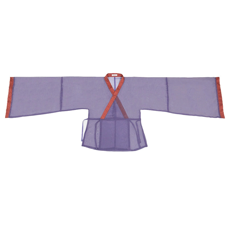 The inner contrast top, in a serene light green, provides a soft foundation. The middle top, adorned with traditional geometric prints in a rich green, introduces a touch of Jin aesthetics. Completing the ensemble is an outer sheer purple top, beautifully accented with contrasting red trim, creating a captivating and colorful finish.
