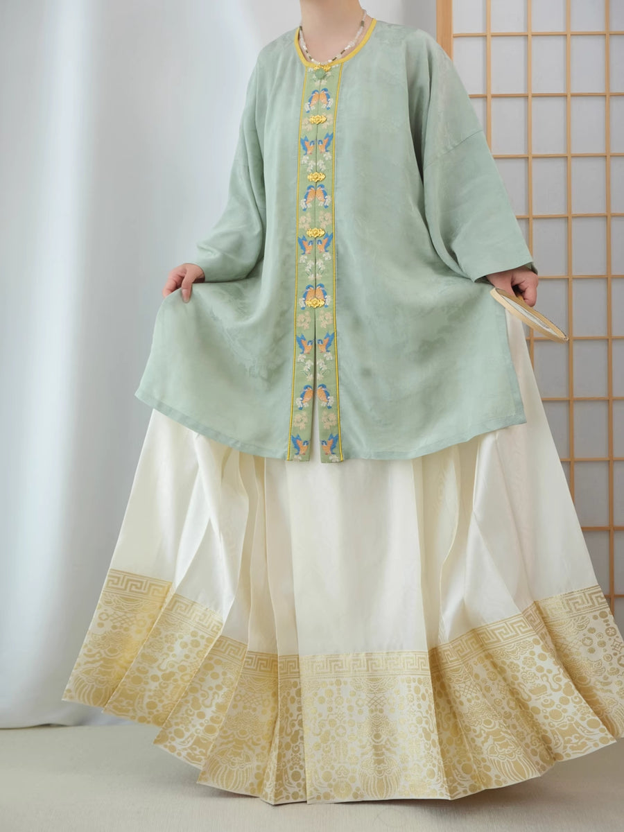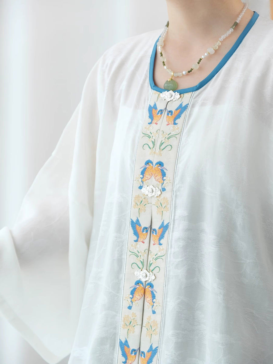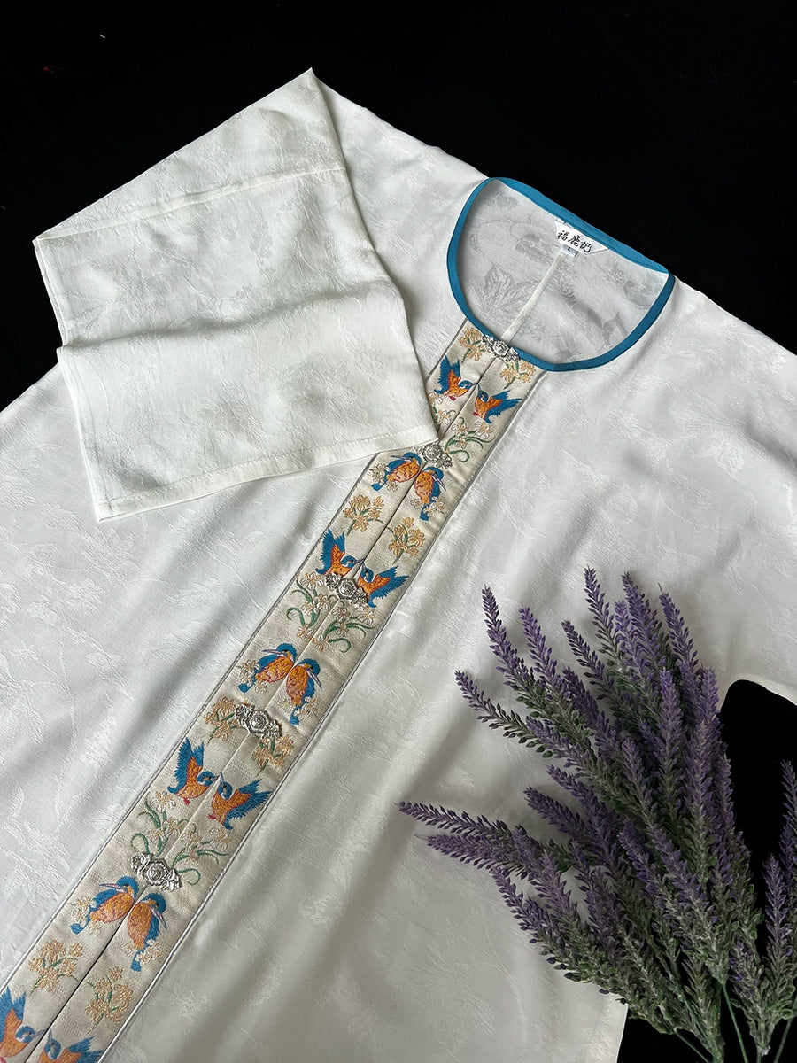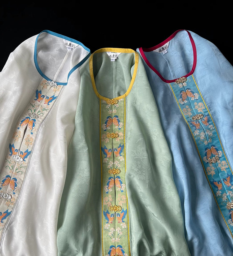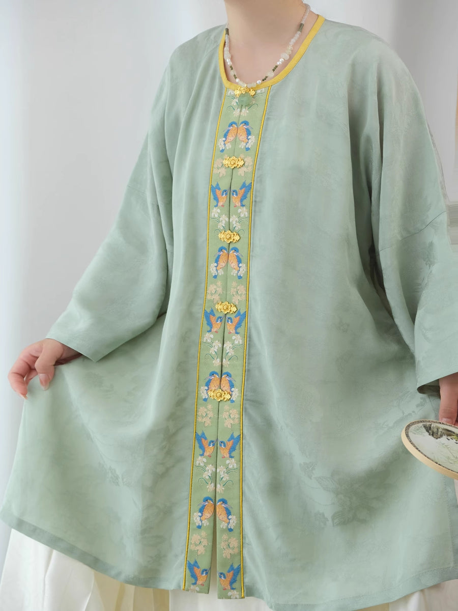 The Yuanling Duijin Shan 圆领对襟衫 (round collar parallel panel shirt) features a classic round collar with a contrasting trim that highlights the neckline beautifully. The brocaded flying robin designs cascading down the bust add a touch of intricate elegance, making this top a standout piece.