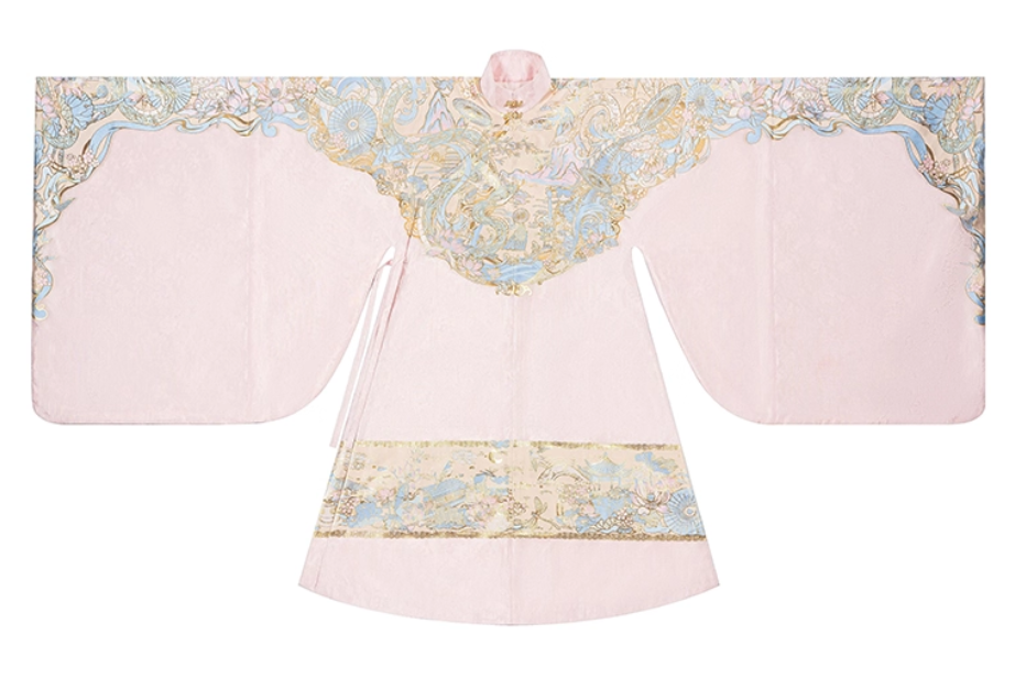 The Liling Chang Ao 立领长袄 (standing collar long shirt), offered in delicate blush pink, cascades down the body with a breathtaking folds and golden threads. Its dramatic, long sleeves sweep across the air, while the high collar frames the face with regal poise.