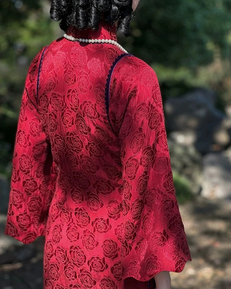 Imprinted with roses that shine in the sun, this qipao features the iconic 1920s flat cut (symmetrical chest trim). Plus, scalloped sleeves and collar add a contemporary touch.