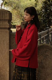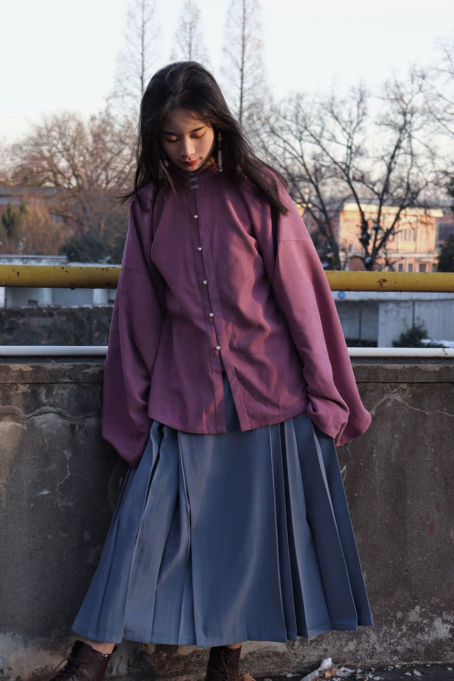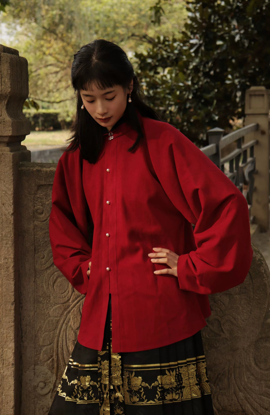 Contrasting collar that can be flipped down for a pop of color, or left flipped up for a sophisticated look. Choose from two classic sleeve styles: Pipaxiu 琵琶袖 or Gongdaixiu 弓袋袖.