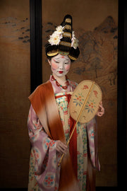 The pibo 披帛, or shawl, is hand-dyed showcasing the iconic ombré Pibo styles seen most in the Middle to Late Tang.