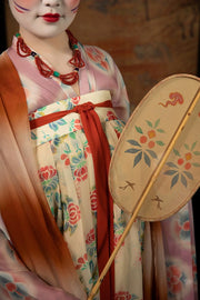 But the star of the show is of course the Qixiong Ruqun 齐胸襦裙, or chest-high skirt, is adorned with bursting flower mandalas. Bigger prints were a key feature in textiles from the High to Middle Tang.