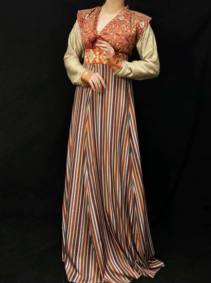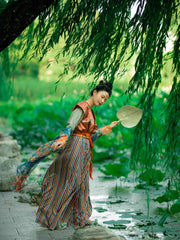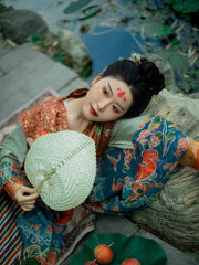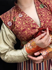 Made from beautiful brocade fabrics, the Beizi 背子 was a quintissential piece of Early Tang hanfu. With patterns of flying phoenixes and floral emblems, the vibrant colors of ancient murals are brought back to life.