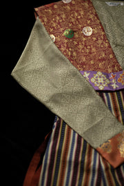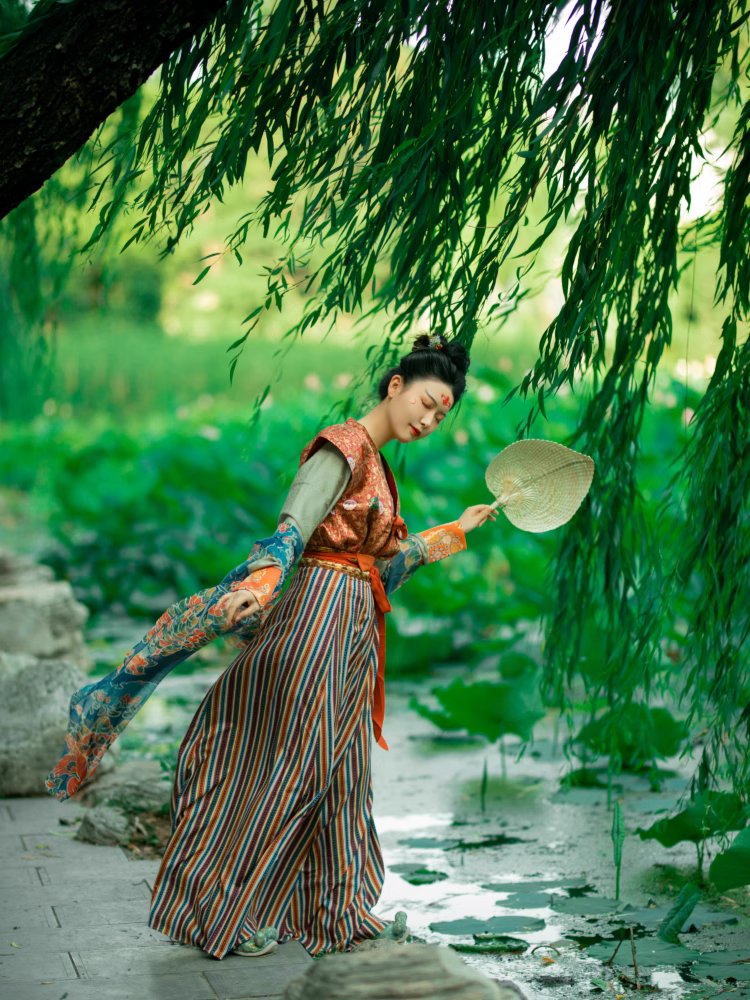 Pair the Beizi 背子 over a the matching honeydew patterned Shan 衫 with contrast brocaded cuffs. And finally finish off with the Poqun 破裙, or "broken skirt", a classic Tang garment made up of multiple strips of fabric sewn together.