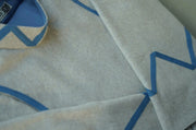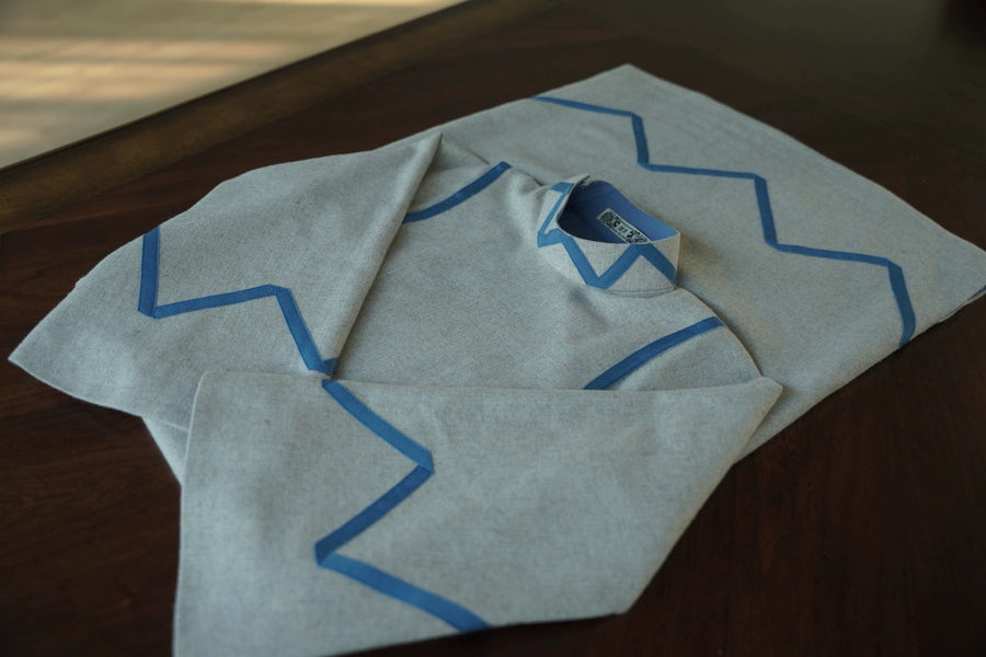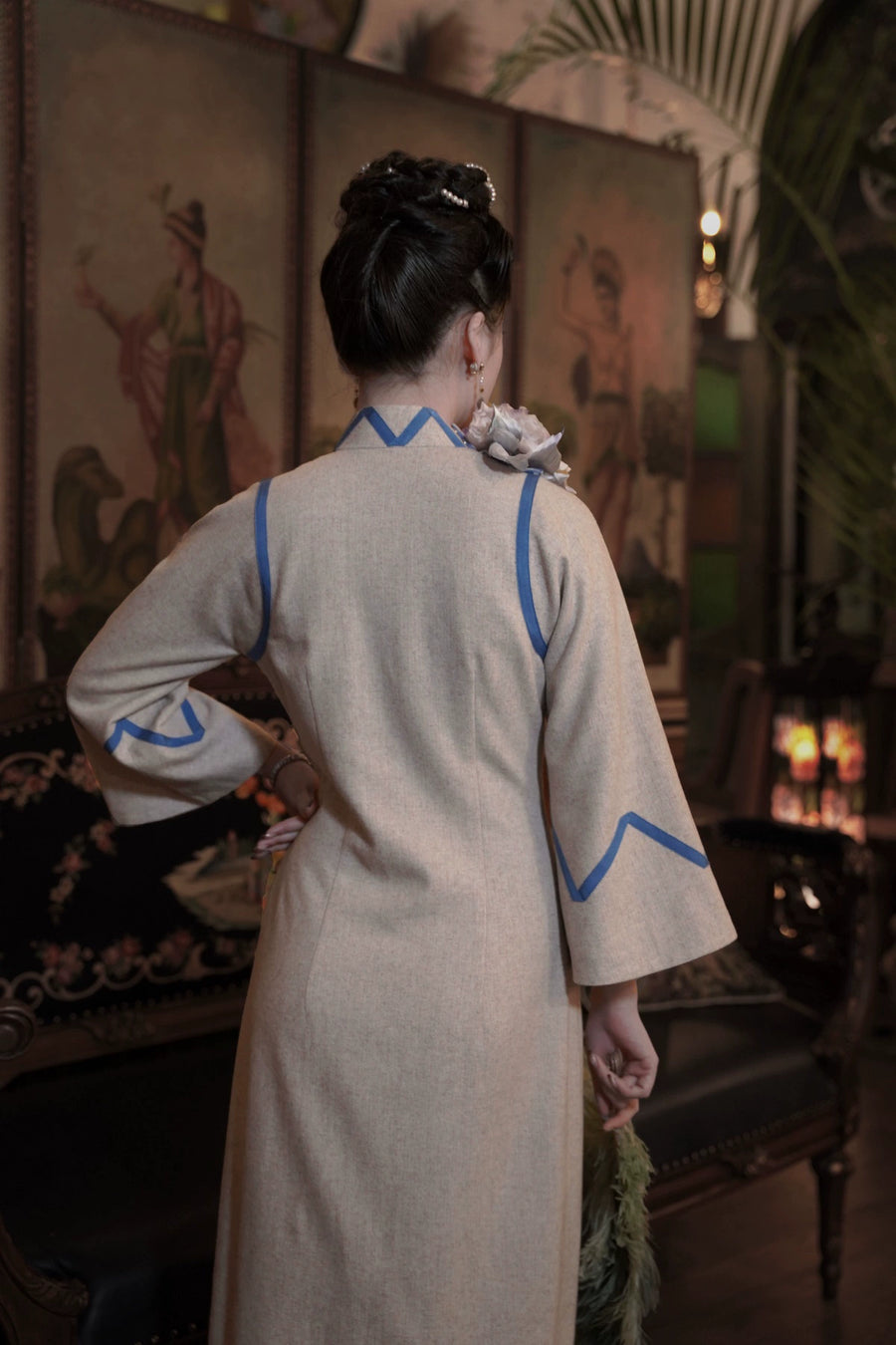Hand sewn woolen qipao with blue minimalist lines along the sleeves, collar, and skirt. Inspired by the Art Deco style of the 1920s, this cheongsam has a contemporary and unique feel.