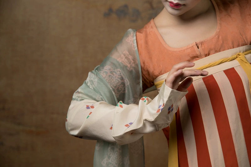 - Shan 衫 with skinny sleeves and 4 diamond print, a popular sleeve style during Early Tang