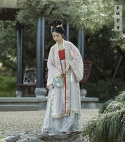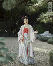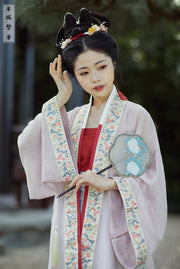 The Beizi 褙子 is a long jacket with brocaded trim around the collar, hem, and cuffs. It features side slits to allow your skirt to peek through, as well as providing ventilation. Collar is lined with both white and red trim, creating a unique contrast against the light taro shade of the main fabric.