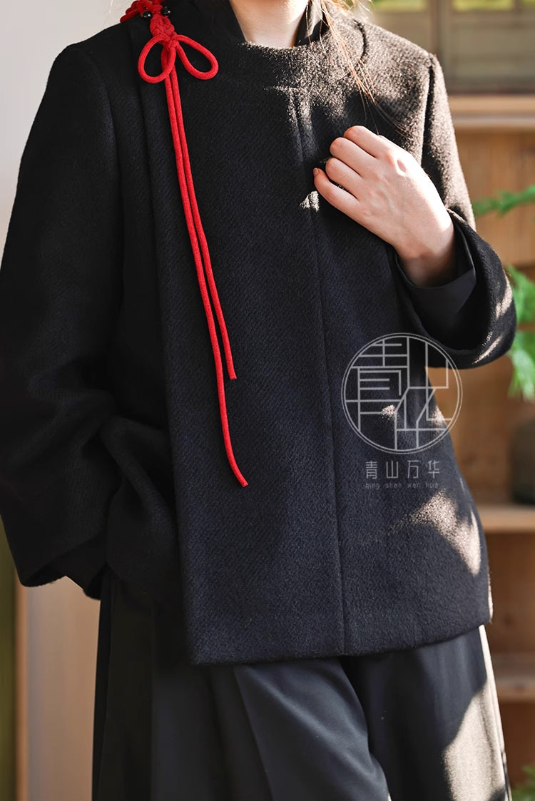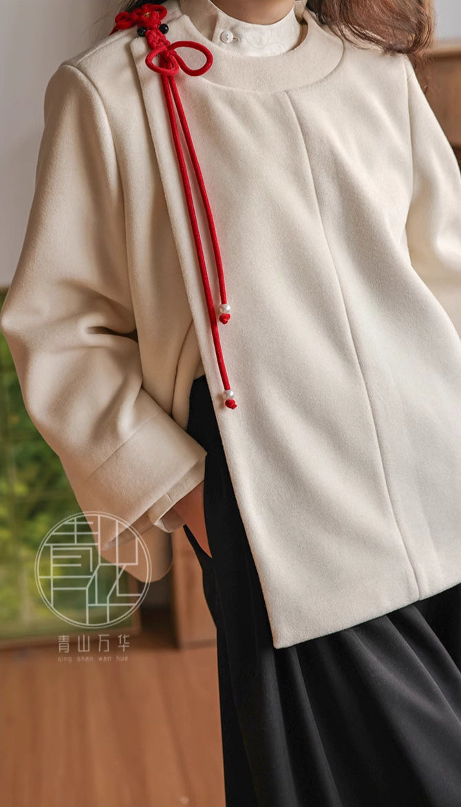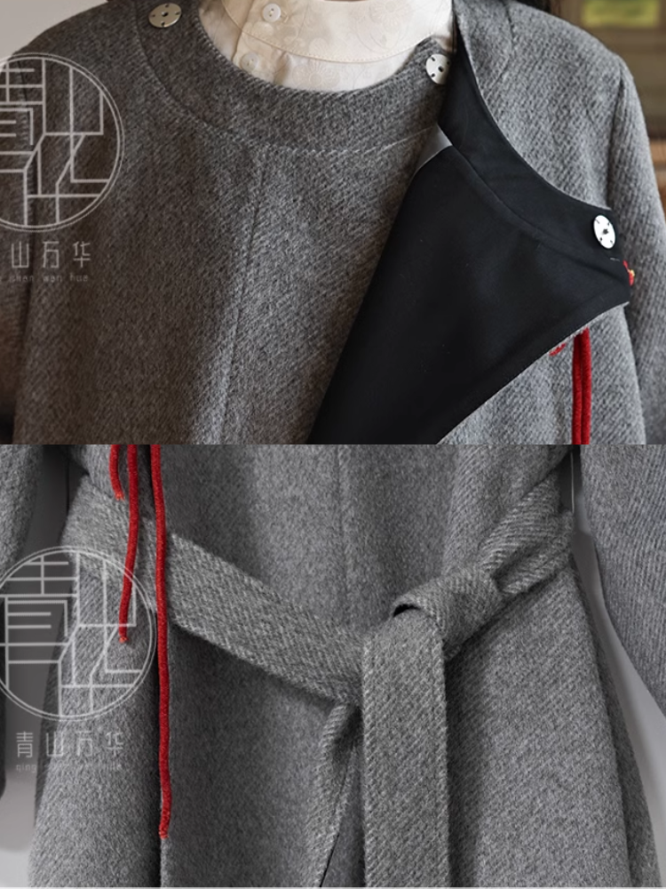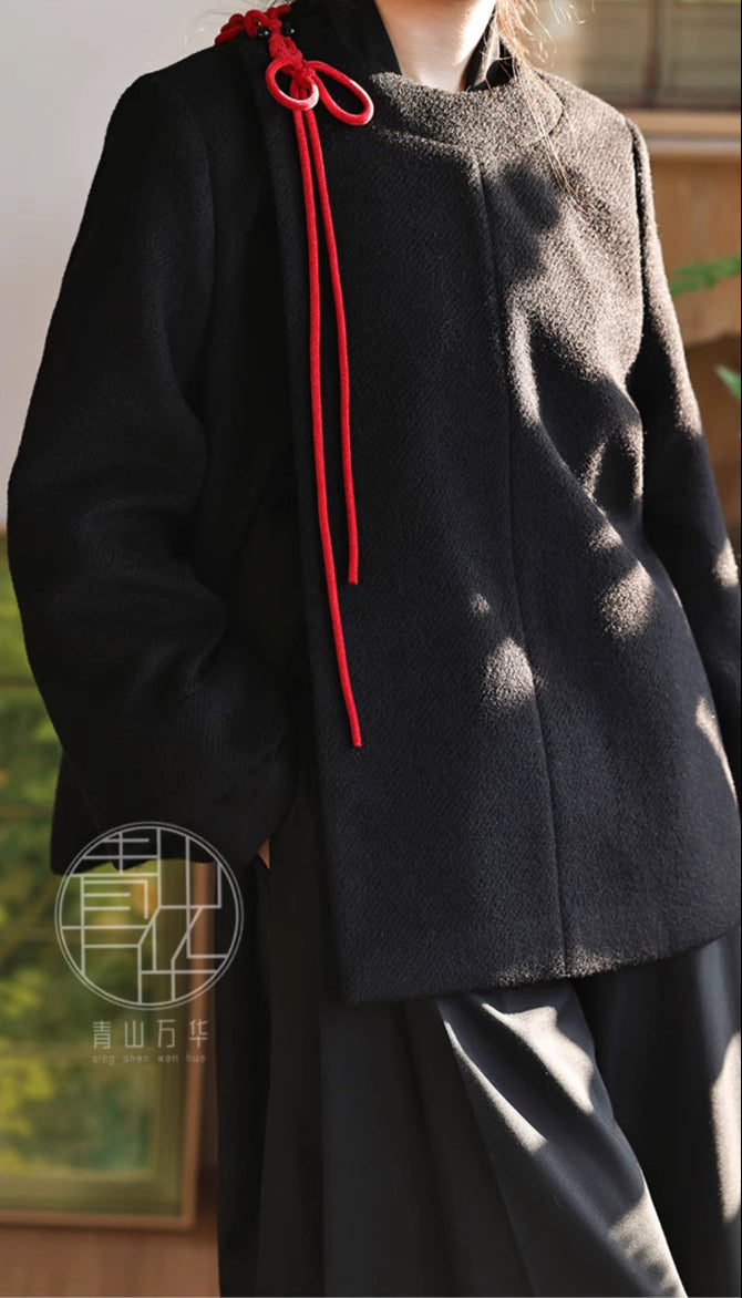 The overall design is rooted in the iconic Yuanlingpao, with a modern twist that reduces bulky fabric under the arms for a streamlined fit. Pockets add practicality, while a hidden metal button secures the neckline and waist, blending traditional and contemporary details effortlessly.
