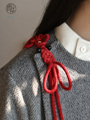 Upon the shoulder, a lucky red Chinese knot in the shape of a butterfly koi at the neckline.