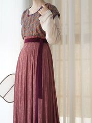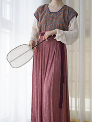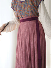 Finish it off with the dusty mauve Zhequn 褶裙 (pleated skirt). The Zhequn differs from other hanfu skirts by offering uniform pleating throughout, no wide panels anywhere. This creates a seamless and flowy effect when worn. A plum colored waist ties add a sweet contrasting element, tying it in with the cuff trim of the Banbi.