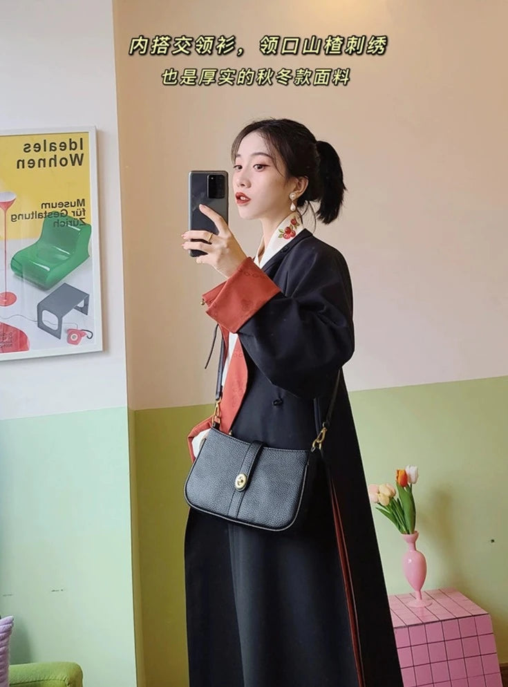 Available in three sophisticated colors—khaki, midnight black, and cinnabar red—this versatile jacket can be worn as a complete Tang outfit, or as a coat over your favorite pair of jeans!