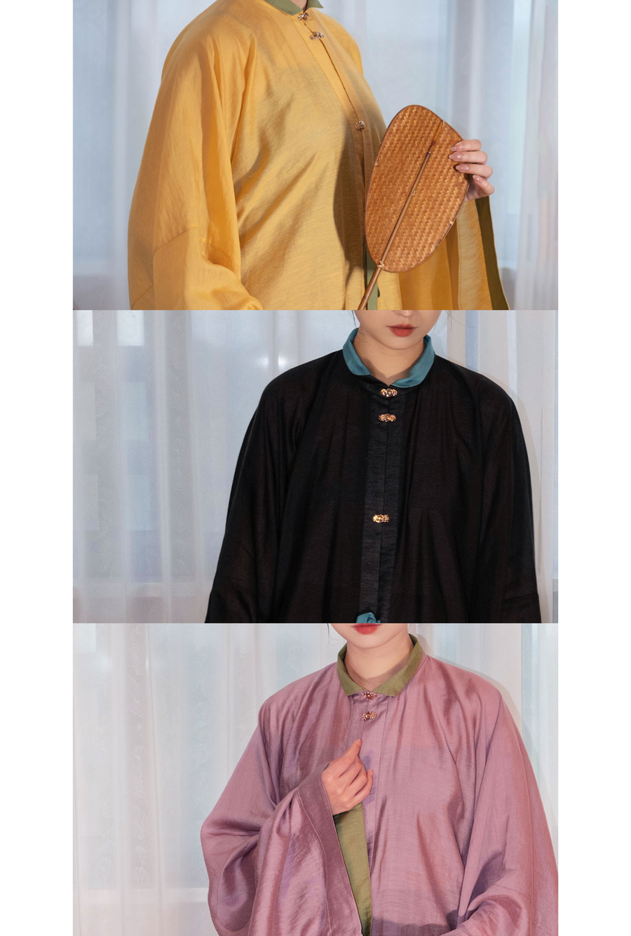 Three colorways with varying contrasting collar lining, inner hem lining, and waist ties. Pair with your favorite Mamianqun 马面裙 (Ming Dynasty "horse face skirt") for an elegant and timeless ensemble, or pair with wide leg trousers for a breezy daily outfit.