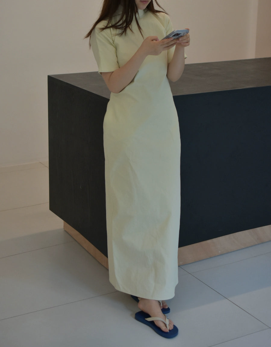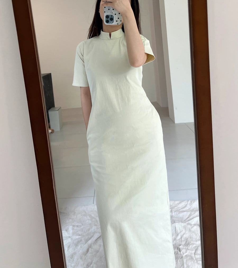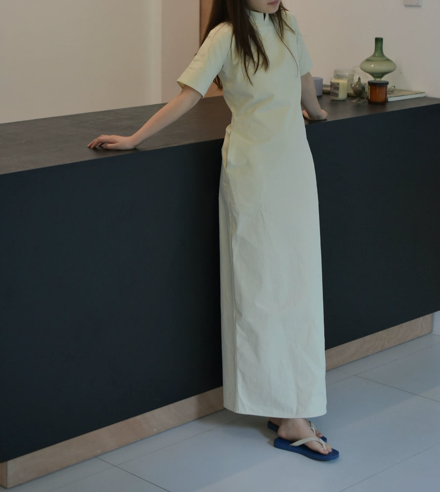 This modernized qipao is made from 100% cotton, providing a breathable and comfortable all-day fit. Silhouette is inspired by 1930s qipaos, with the signature wide and loose shape, longer hem, and lower side slits.