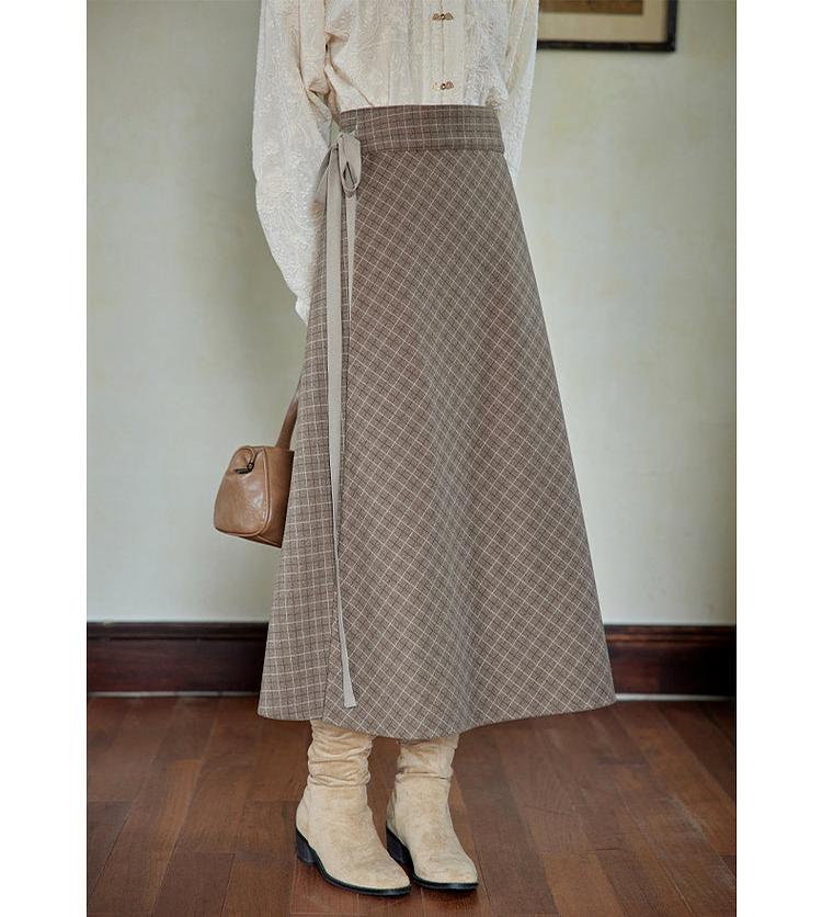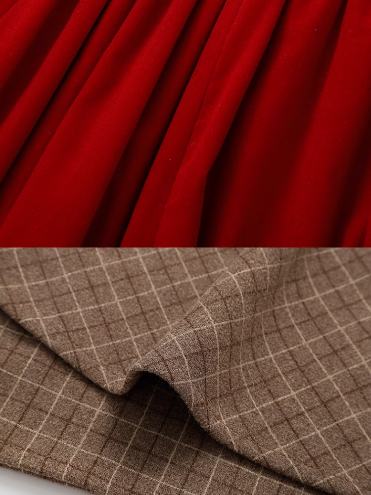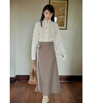 Additionally choose between a red midi skirt or plaid wrap skirt. Red skirt contains matching deer print along the hemline, and an elastic waist suitable for the goddess on the go. Plaid wrap skirt is made in the image of Song Dynasty Xuanqun 旋裙.