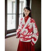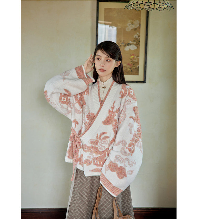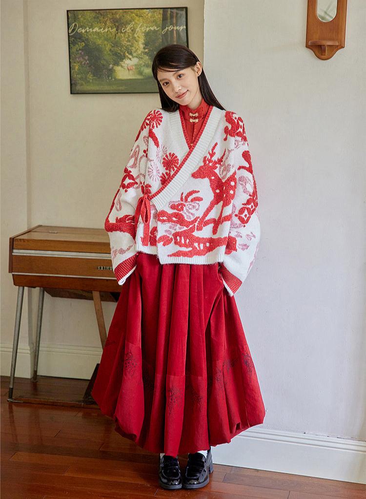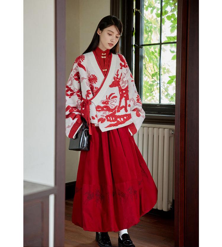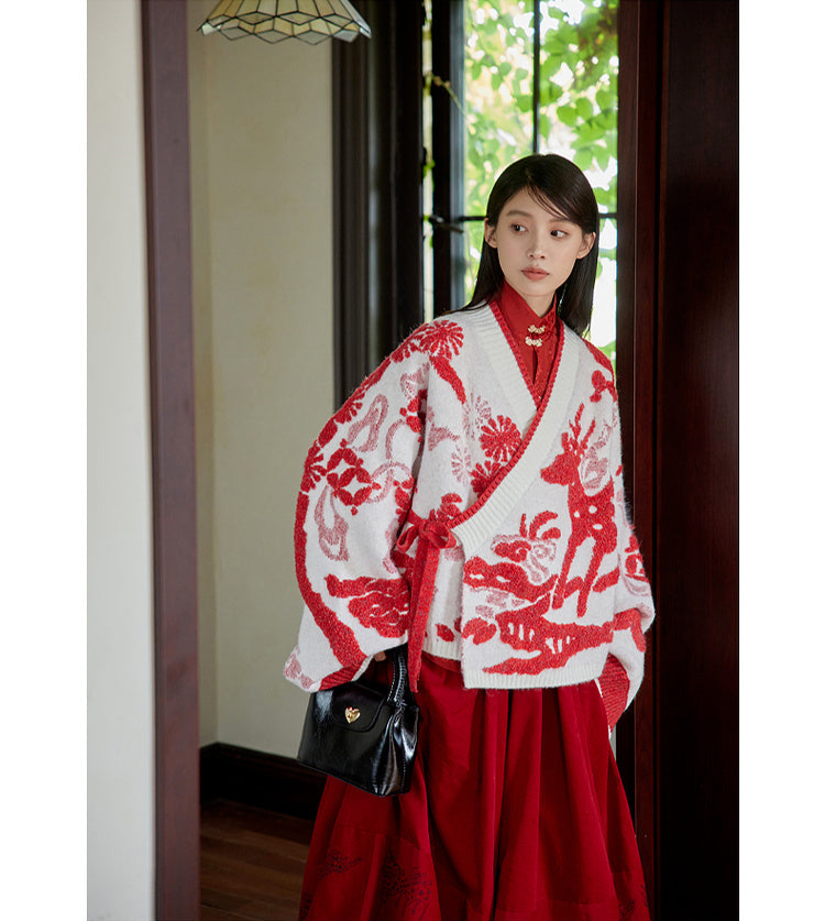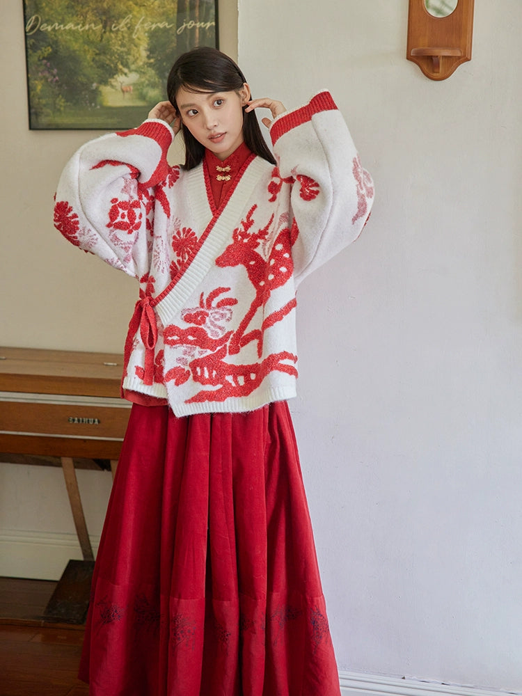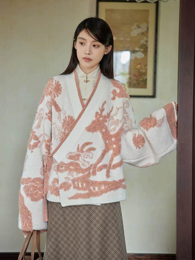 Step into a world of charm and prosperity with this cozy cardigan set! Full of prancing deer patterns, this is a stunning set that brings the warmth of classic Chinese symbols into a modern, stylish form. Based on the traditional Jiaoling Shan 交领衫.