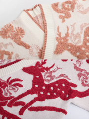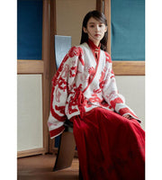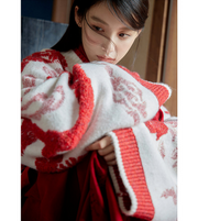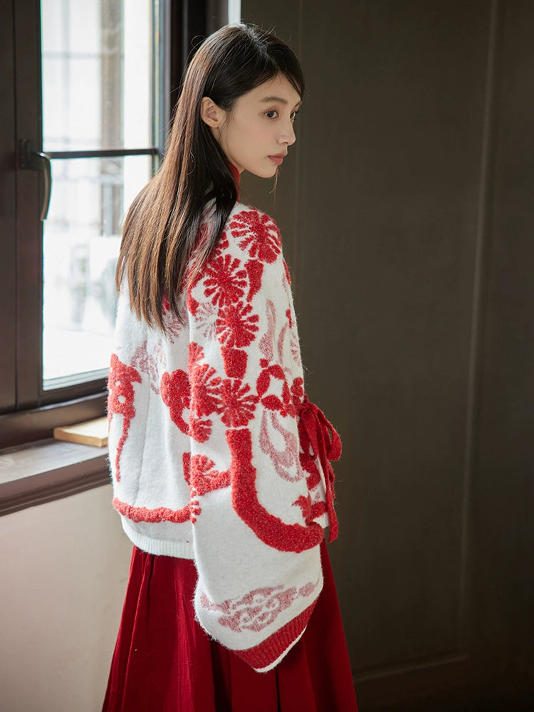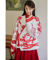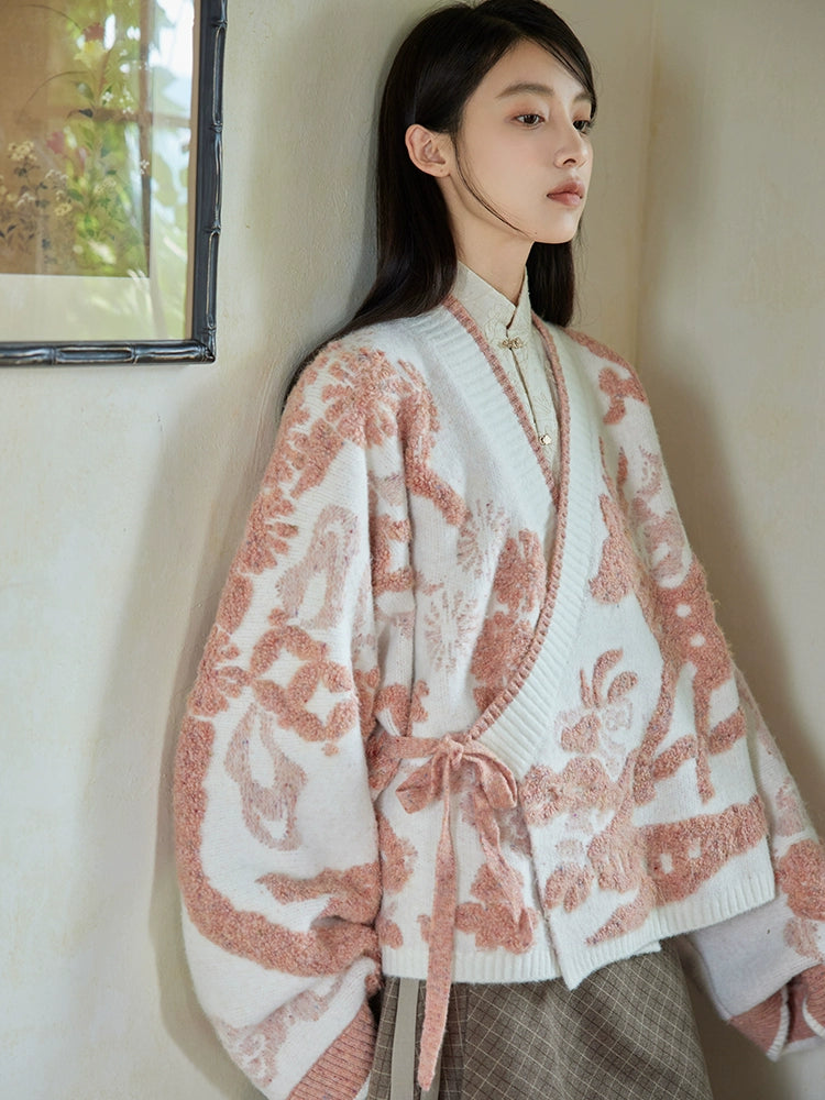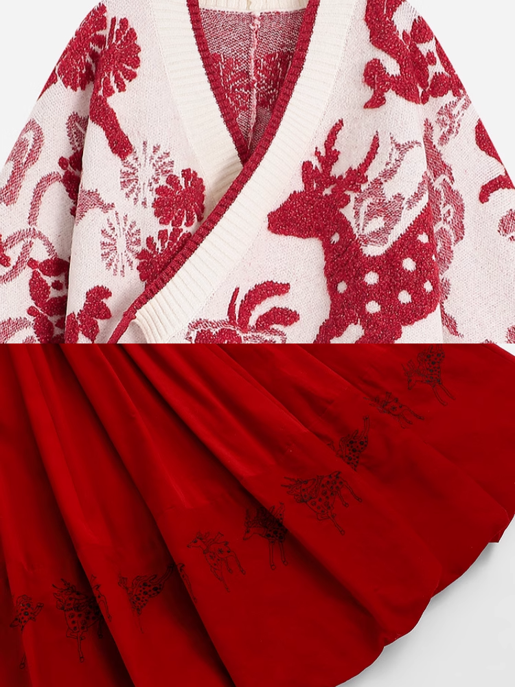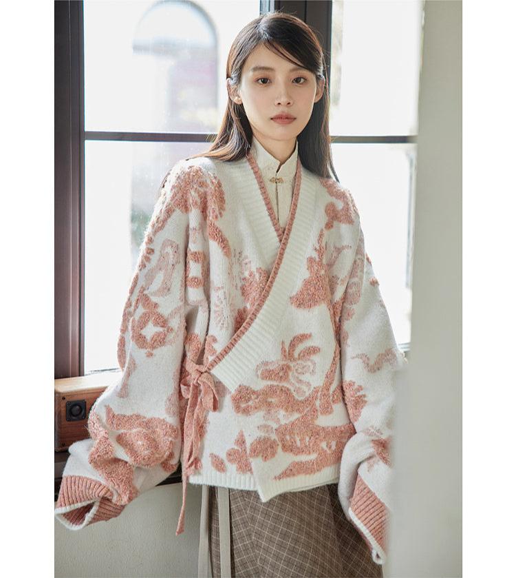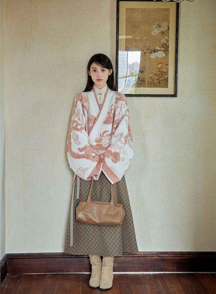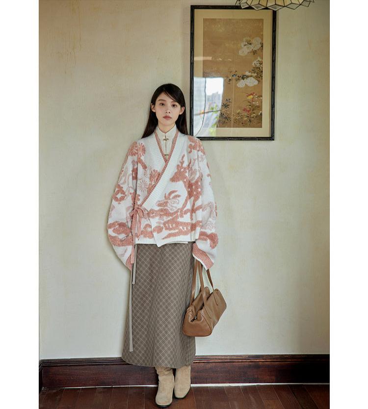 Step into a world of charm and prosperity with this cozy cardigan set! Full of prancing deer patterns, this is a stunning set that brings the warmth of classic Chinese symbols into a modern, stylish form. Based on the traditional Jiaoling Shan 交领衫.
