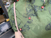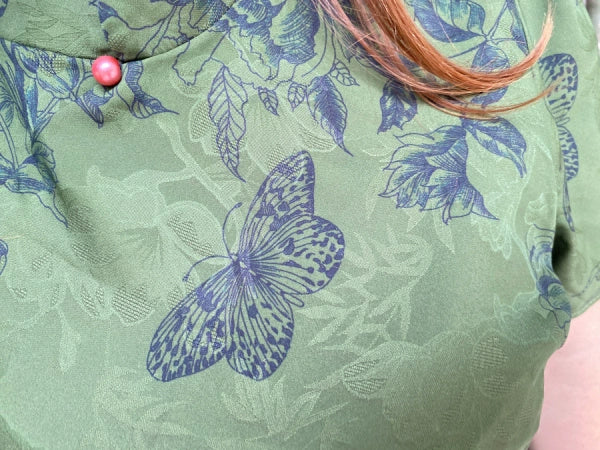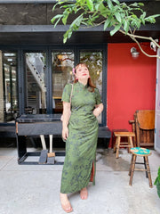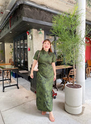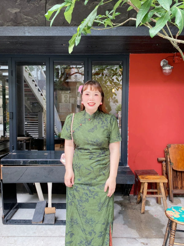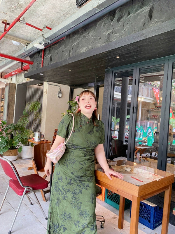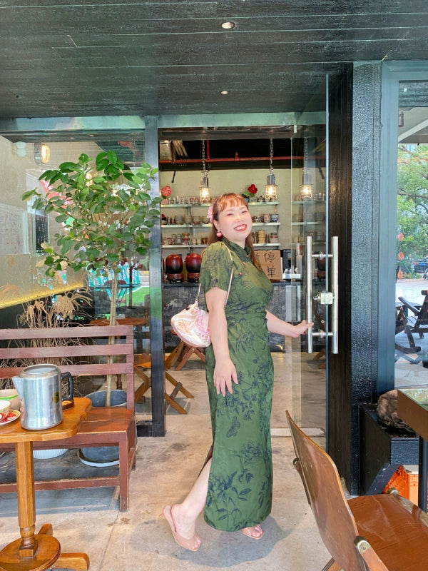 Crafted in a rich, dark army green fabric, this qipao features a subtle yet striking black floral print. Bold red buttons add a pop of color, perfectly complementing the qipao’s classic design.