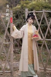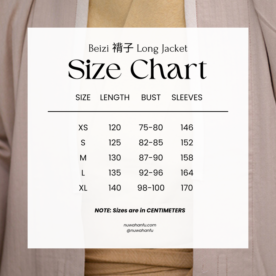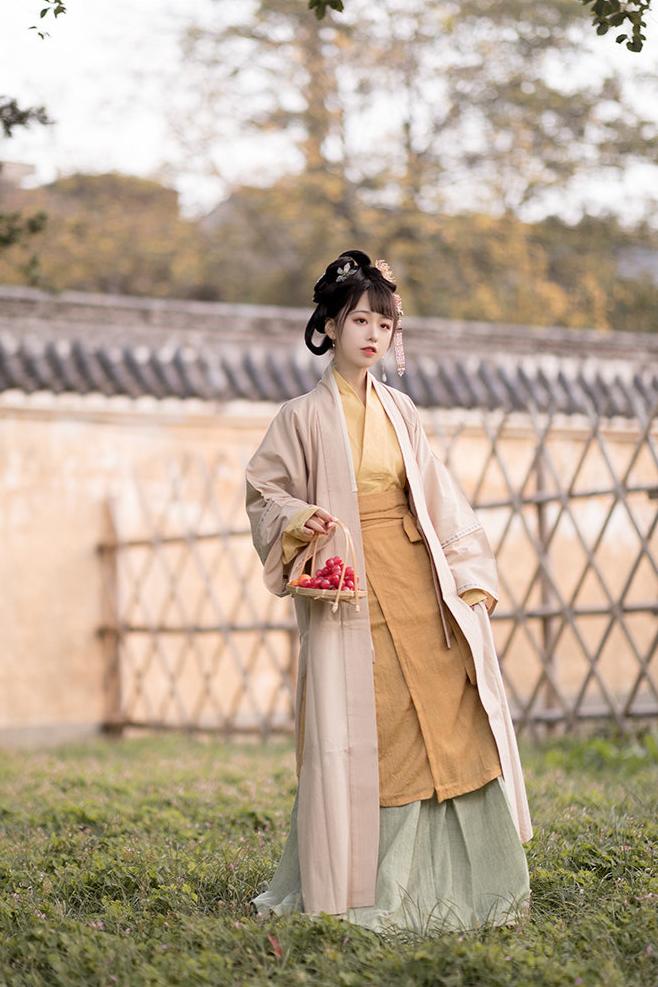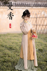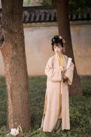 Consisting of a Beizi 褙子 (long jacket) with delicately detailed cuff lining, layered on top of a honey colored Feijixiu 飞机袖 (cross collar airplane sleeve top). Both tops are versatile and can be paired with other historical or modern tops.