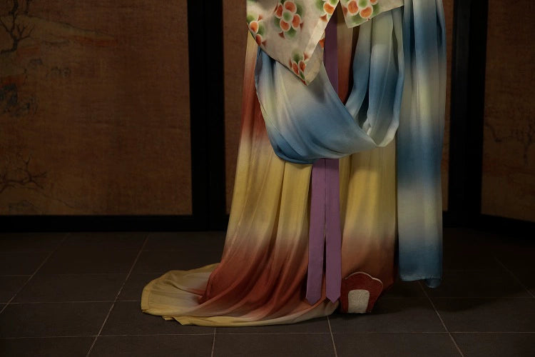 The pibo 披帛, or shawl, is also hand-dyed with Tang ombré, creating a dimensional and ethereal outfit.