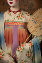 One of the most colorful and vibrant eras in all of hanfu history, this Ode to Dunhuang 敦煌颂 Late Tang Buddhist Donor set made of 100% mulberry silk showcases the excellent fabric and dye techniques of the Tang.