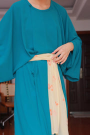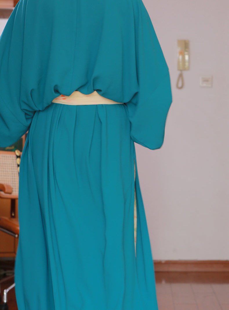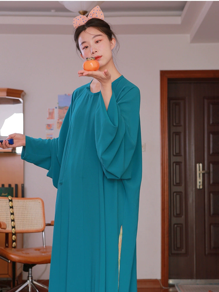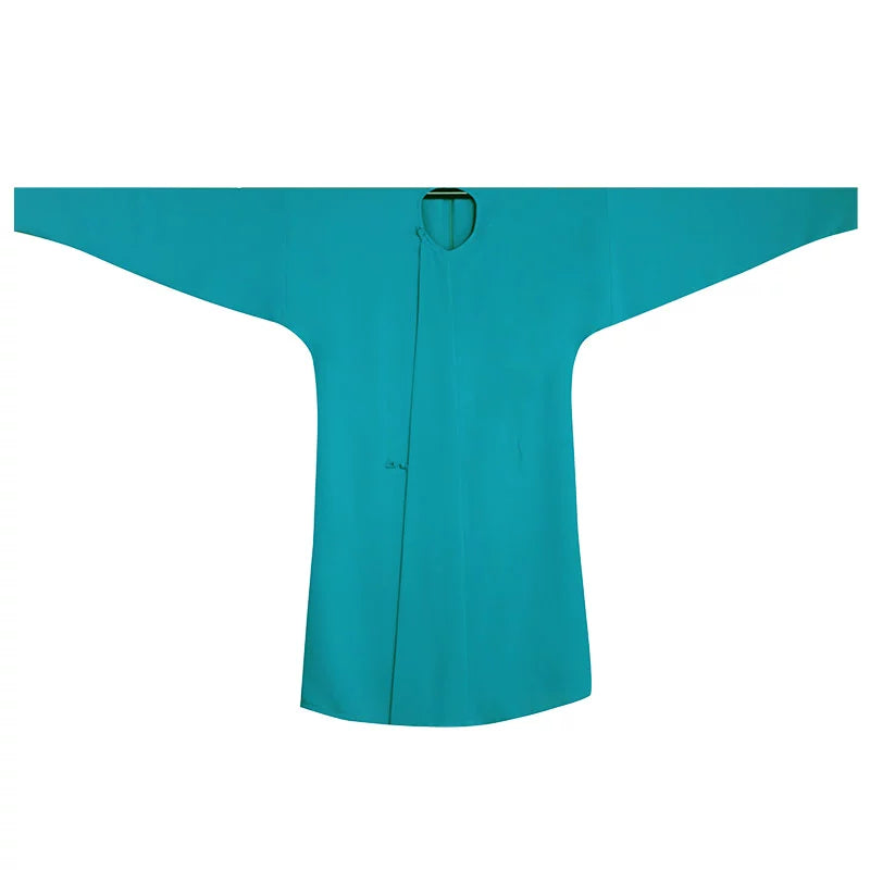This unisex ensemble features a lightweight and breathable rayon robe in a vibrant teal hue, ideal for the mild temperatures of spring and autumn. The long slits along the side allow for ventilation, while the loose fit ensures ease of movement throughout the day.