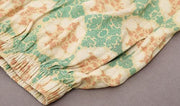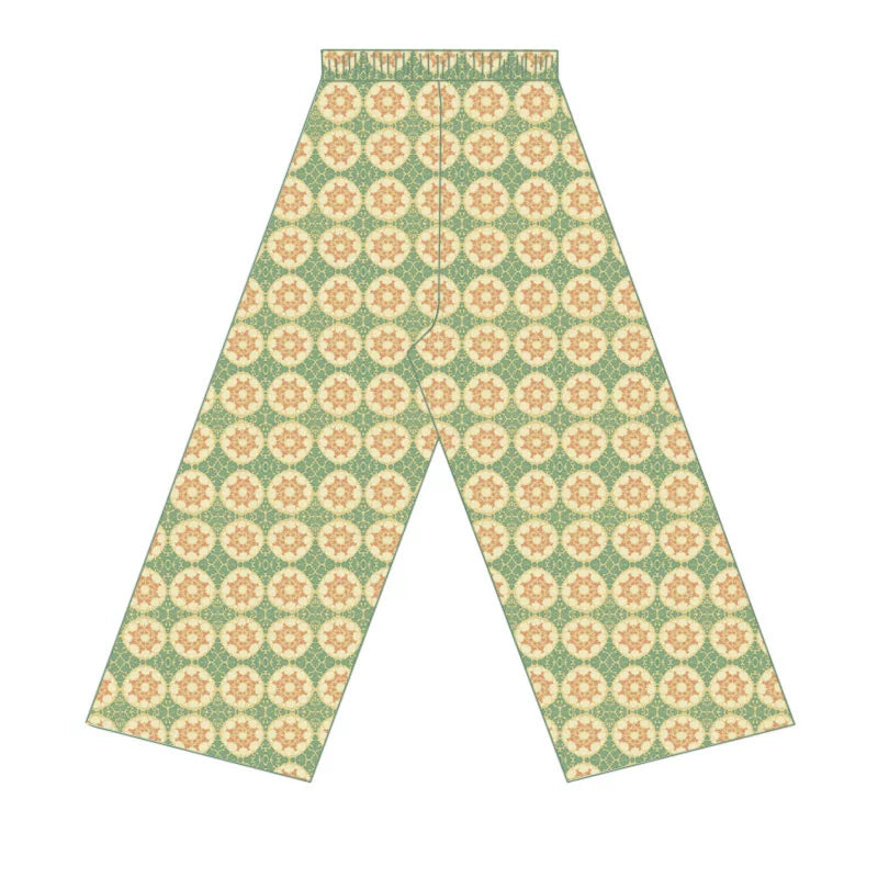 Complementing the robe are wide-legged pants made from Tencel, a fabric that mimics the texture of linen with added softness. Adorned with a subtle floral pattern in soft pastel tones, elastic waistband for versatile comfort, and pockets!