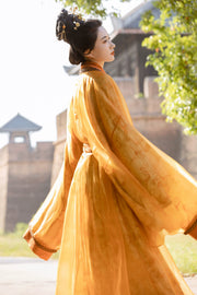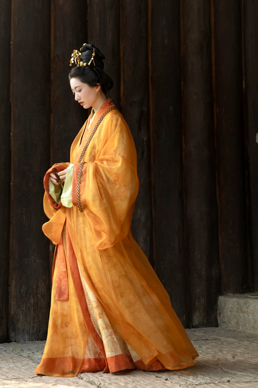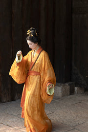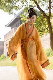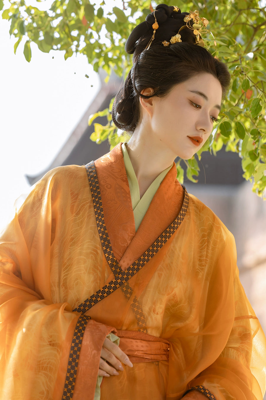 In a contemporary sunset orange color, the layered Zhiju 直裾 create a dimensional and flattering silhouette. Inner robe is printed with a marbled water texture that catches the light like water in the sun, while the collar contains intricate brocades of Han textile artifacts.