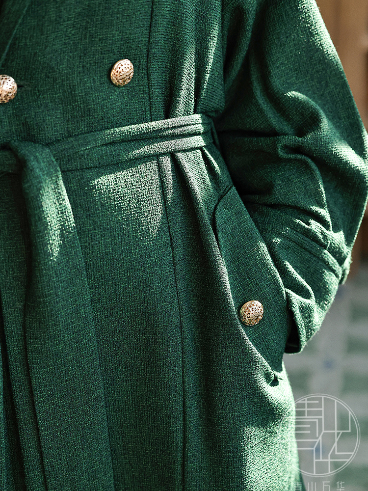 Wide, layered lapels mimic the collars of Han fashion; a large crossed panel front and belt mirrors the styling of traditional clothing. Modern touches such as golden buttons, Western cuffs, and tailored seams add an aura of sophistication.