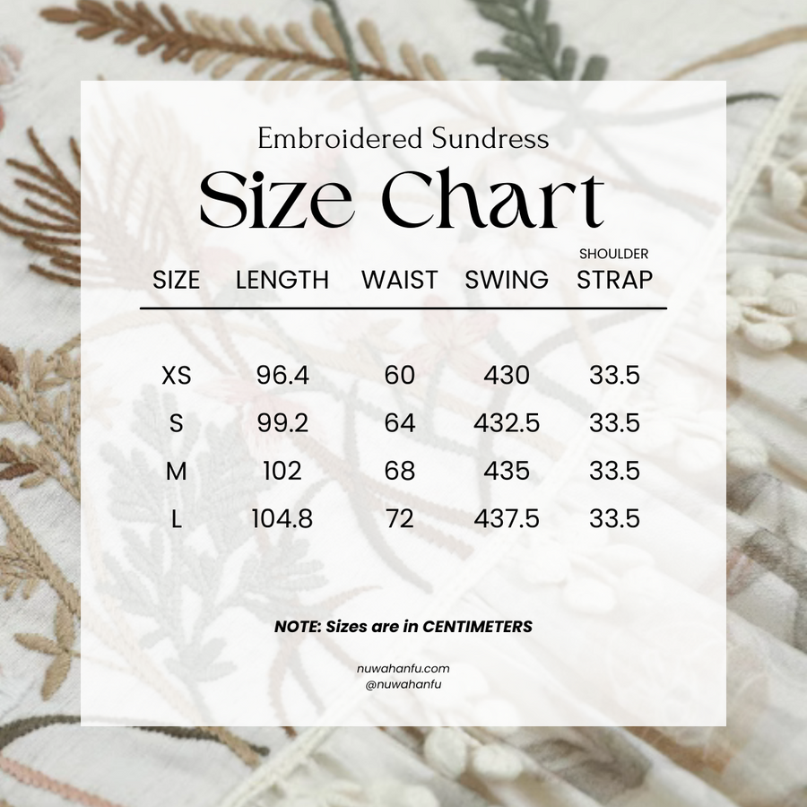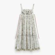 This sundress features the iconic hezi 何子 (chest band), a trend from the Later Tang Dynasty. Following the styles of Heziqun 何子裙 (bandeau dresses), this floral piece has an elongating chest-high silhouette. Adorned with delicate floral embroidery that dances across a soft floral print, this dress is great for layering over any modern or traditional top.